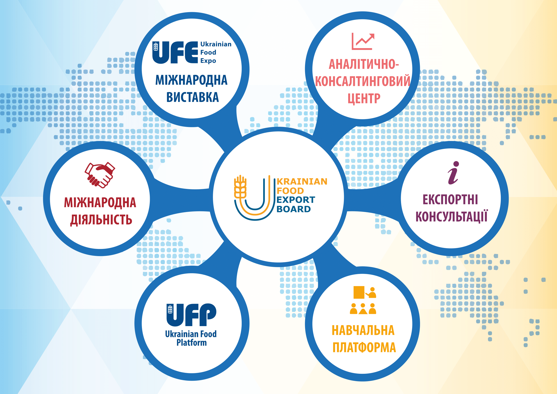 Ukrainian Food Export Board (Рада з питань експорту продовольства) – це громадська спілка, яка допомагає виробникам сфери харчової промисловості здобувати нові ринки збуту та закріплюватися на традиційних, надаємо аналітичну інформацію та консультуємо щодо можливостей та умов торговельної діяльності за кордоном.